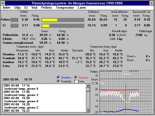 Bilden ovan visar "huvudfönstret" i pannstyrningsprogrammet. Här har jag god överblick över driften av villapannan.