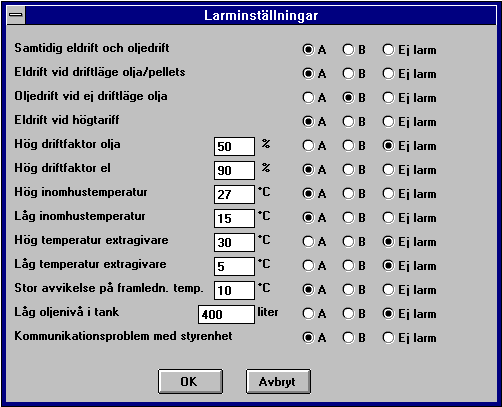 Ovanstående bild visar vilka olika larm som systemet hanterar.
