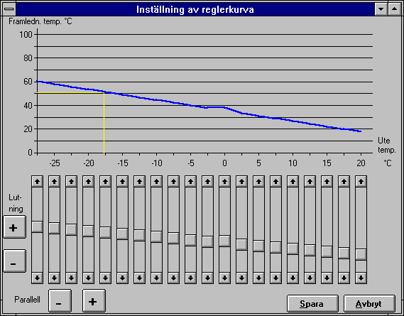 Ovanstående bild visar inställningsfönstret för reglerkurvan. Kurvan har 20 brytpunkter vilket ger en noggrann justering. Möjlighet finns även att på ett enkelt sätt ändra lutning och parallellförskjuta hela kurvan. De gula linjerna i diagrammet visar var på kurvan rådande driftsituation befinner sig. Lägg märke till att jag höjt kurvan något vid nollgradig utetemperatur, detta för att kompensera mot det "råa inomhusklimat" som man ofta upplever vid denna utomhustemperatur.
