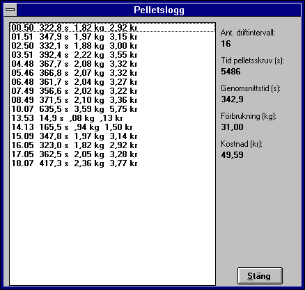 Ovanstående bild visar loggfunktionen för pellets. I detta fönster kan jag ta del av uppgifter om varje enskilt driftsintervall. Ovanstående logg avslöjar t.ex. att brännaren hade lite problem att tända pelletsen kl. 13.53 och behövde därmed göra ett extra startförsök. Detta berodde troligen på att brännaren var kall eftersom den då inte hade gått på några timmar.